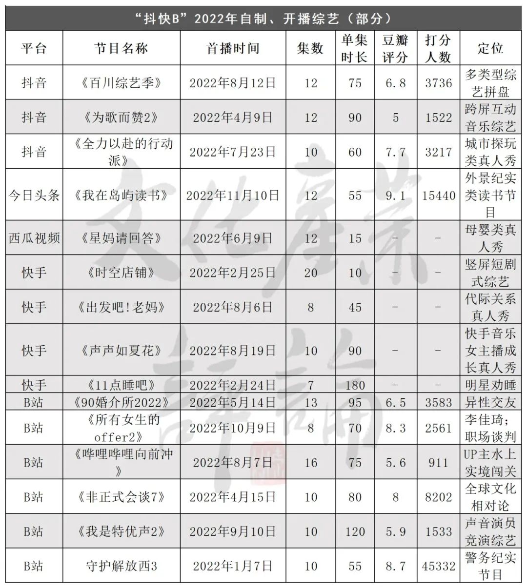 △2022年“抖快B”自制、开播综艺(部分) 数据来源:根据豆瓣、猫眼等平台整理