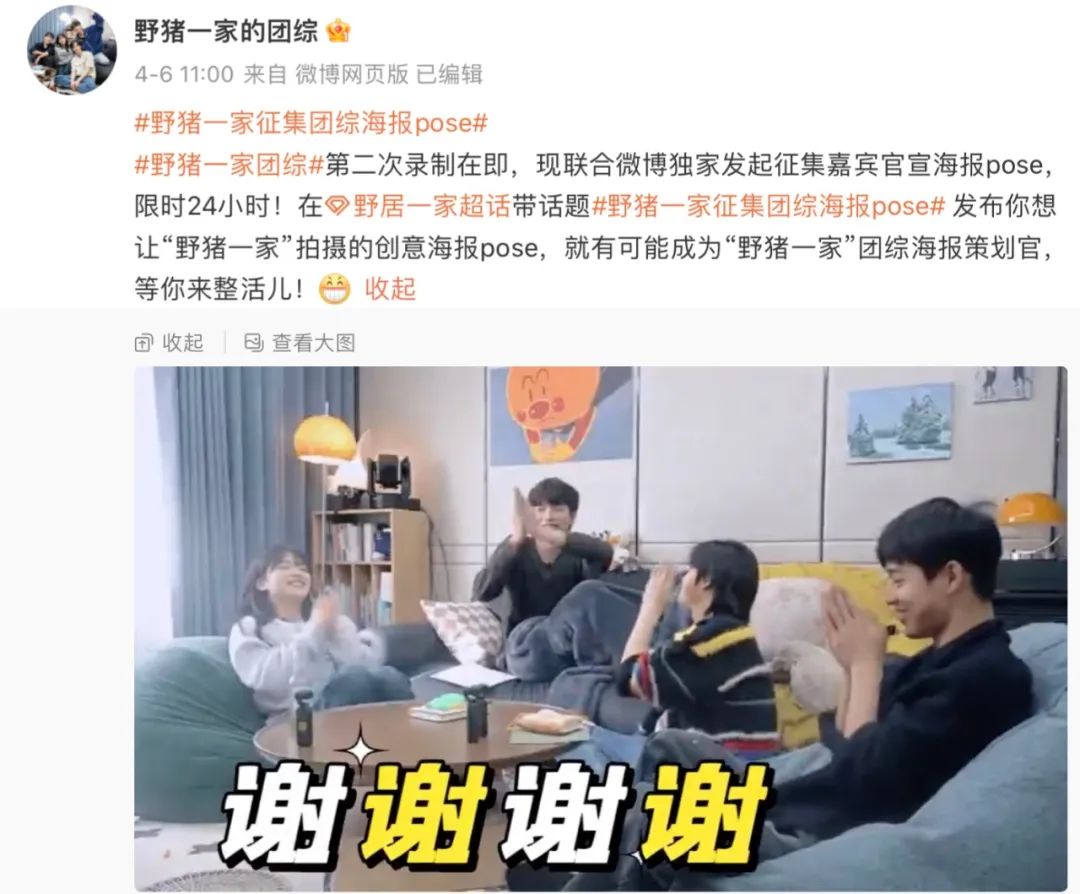 时至2023的Q2,我们发现这类toC小综艺正在雨后春笋般涌现。比如,最近有档剧集衍生小团综《野猪一家》备受关注,这个号称“国内首部vlog 团综”的节目,由因为拍摄《开画!少女漫》相识的几个主演共创。他们最近开通了官博向全网征集海报pose,这种玩法很容易让人想起去年“再就业男团”在线征集节目名的爆梗事件。