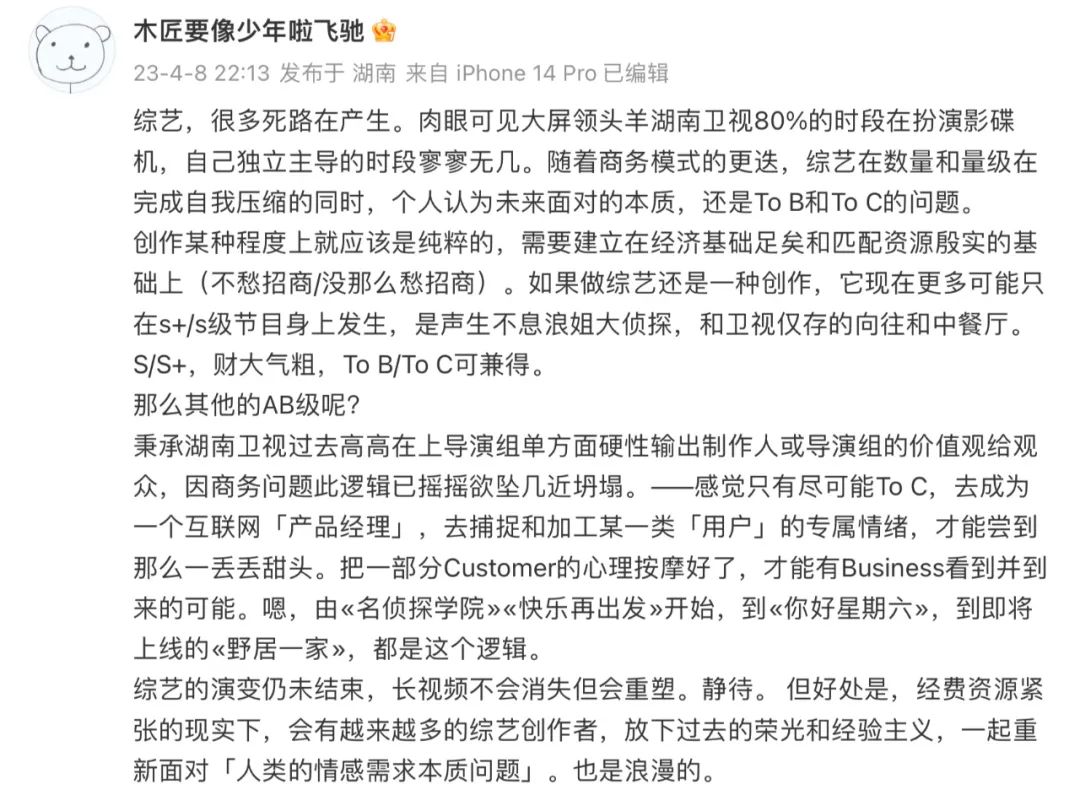前有《综艺行业或许该推倒重来了》一文刷屏,后有博主“木匠要像少年啦飞驰”提出综艺toC化是大势所趋的观点,都带动了与之共鸣的从业者纷纷建言献策。