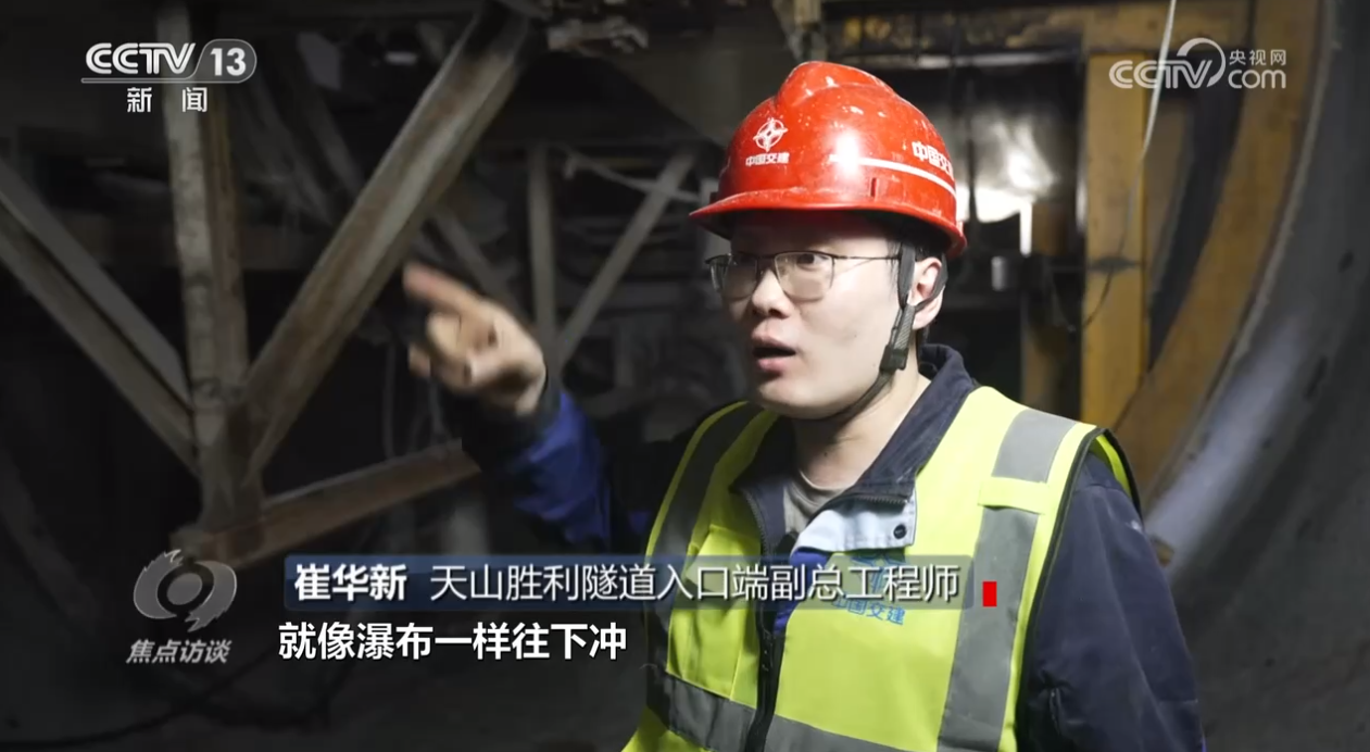 天山胜利隧道入口端副总工程师崔华新:“头顶往上塌了将近20多米,还有一股水,很粗的一股水在头顶,就像瀑布一样往下冲。”