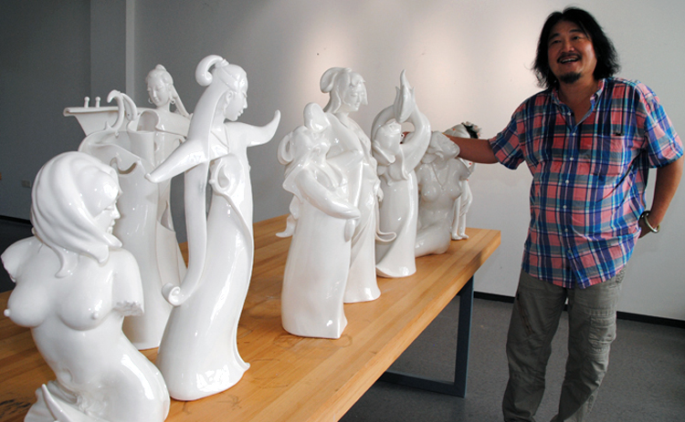 图:雕塑家裴铁涛和他的“欲火柔情”系列雕塑作品(摄影 黄坚)