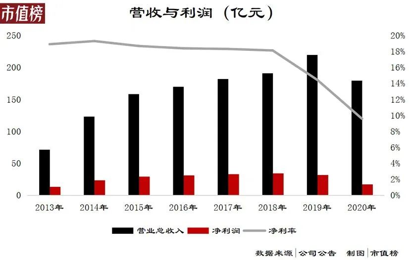 2020年年底,海澜集团迎来了新转折,创始人周建平辞去董事长位置,正式交棒儿子周立宸;2021年4月,海澜之家披露了自上市以来最低的年报盈利,受疫情冲击,公司在2020年实现营业收入179.6亿元,较2019年减少了18.3%,归母净利润才17.8亿元,同比大跌44.4%。