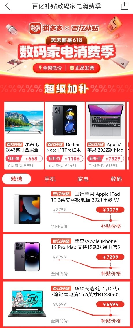 拼多多百亿补贴启动的“数码家电消费季”,将在百亿补贴的基础上再次投入10亿真金白银,对数码家电全品类进行额外补贴。相关负责人表示,“数码家电消费季”将为消费者提供“天天都是6·18”的购物体验。