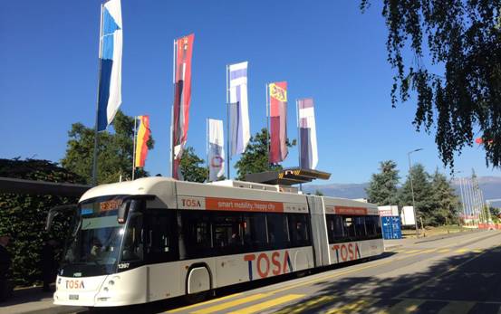 目前,日内瓦的23号线成为世界首条TOSA公交车线路。其跨越分隔日内瓦市区、东西走向的罗纳河,贯穿南北城区,全长12公里,沿途设13个“闪充站”,配备12辆TOSA公交车。
