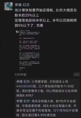 幻方量化市场总监李橙就在朋友圈公开发文称,预计三六零将开始定增,比例约为总股本25%以上。定增完成后,胡欢持有三六零的比例将稀释到5%以下,从而方便一次性减持。