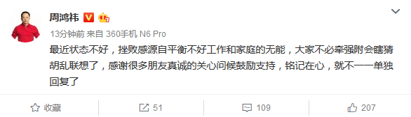 周鸿祎发微博称“平衡不好工作和家庭”,来源:周鸿祎微博