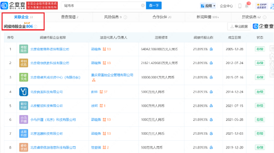 企查查显示,周鸿祎关联企业有33家,间接持股企业超800家。而周鸿祎前妻胡欢间接持股企业超700家,两人间接持股企业一共达1500家。
