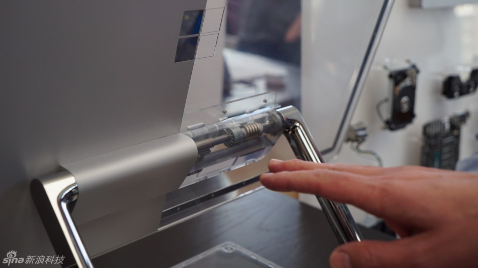 得益于背部的铰链设计,Studio的28寸屏幕可以直接推倒在桌面上,最低实现20度倾斜,期间可以无级调整。新浪科技在现场推倒了Studio多次,发现屏幕调整过程中非常顺畅,完全没有摇晃不稳的感觉。