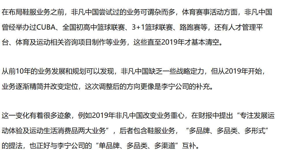 有文章指出,2019年开始,非凡中国的业务定位逐渐精简明晰,调整后的方向更像是“李宁公司的补充。”其中有一个佐证便是,非凡中国的财报提出了“多品牌、多品类、多形式”,正好与李宁公司的“单品牌、多品类、多渠道”互补。