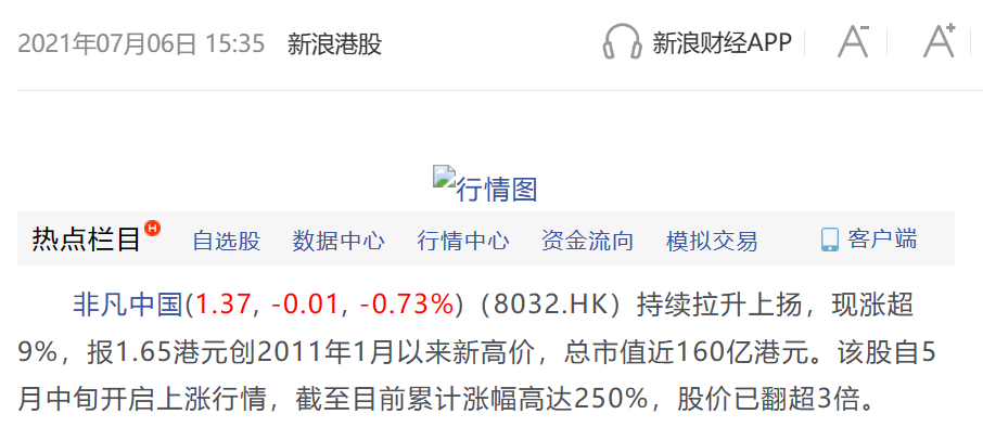 系列利好加成, 2021年5月中旬至7月初,非凡中国累计涨幅高达250%,股价翻3倍。