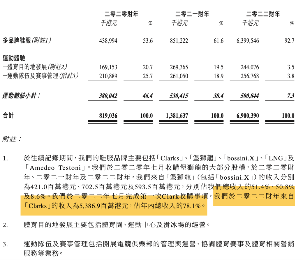 对外收购是非凡中国扩张该业务板块的主要方式。在堡狮龙、Amedeo Testoni、Clarks等非凡中国收购的诸多国际品牌中,2022年最新收购的Clarks是最重要的收入来源。据招股书,2022年来自Clarks的收入为53.86亿港元,占总收入比78.1%。