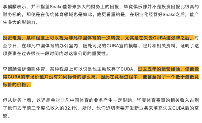 一件是,非凡中国“主动放弃”了运营5年之久的中国大学生篮球联赛(CUBA);另一件,便是斥资数亿元现金掌握了Snake电竞俱乐部的“绝对控制权”。