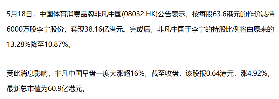 2021年5月,非凡中国宣布将卖出6000万股李宁股份。消息发出后,非凡中国当日股价大幅上涨。