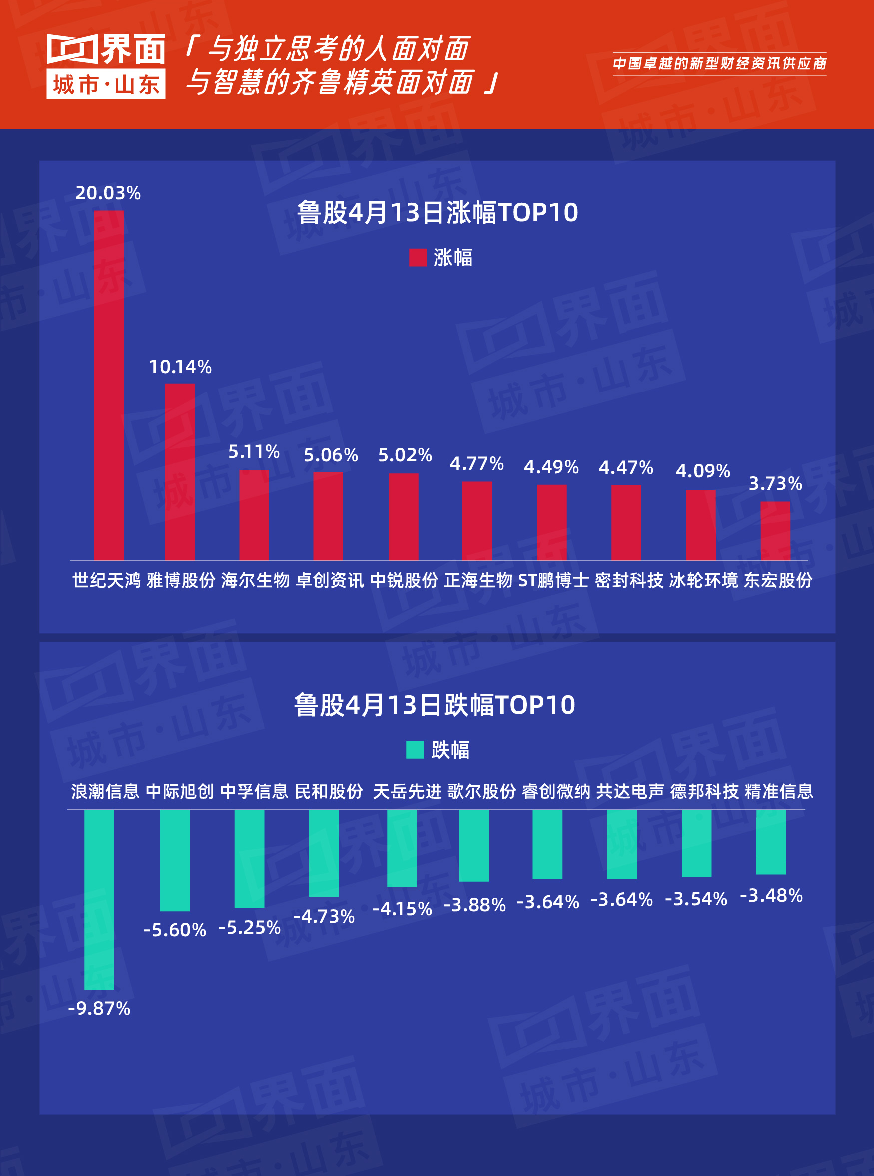 4月13日,山东省内沪深股票有110只个股上涨,174只个股下跌;总市值过千亿的有万华化学(600309)、海尔智家(600690)、兖州煤业(600188)、青岛啤酒(600600)、山东黄金(600547)、中航沈飞(600760)、潍柴动力(000338)共7家,500亿-1000亿的共有6家,分别是歌尔股份(002241)、华鲁恒升(600426)、华电国际(600027)、浪潮信息(000977)、华熙生物(688363)、中际旭创(300308)。