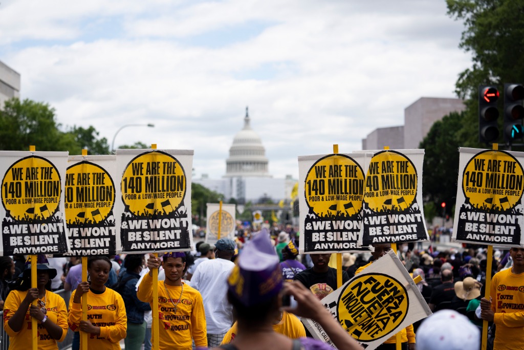 2022年6月18日,来自美国全国各地的数千民众在华盛顿国会大厦附近举行集会,抗议美国根深蒂固的种族歧视以及由此引发的经济不公等一系列社会问题。新华社记者刘杰摄