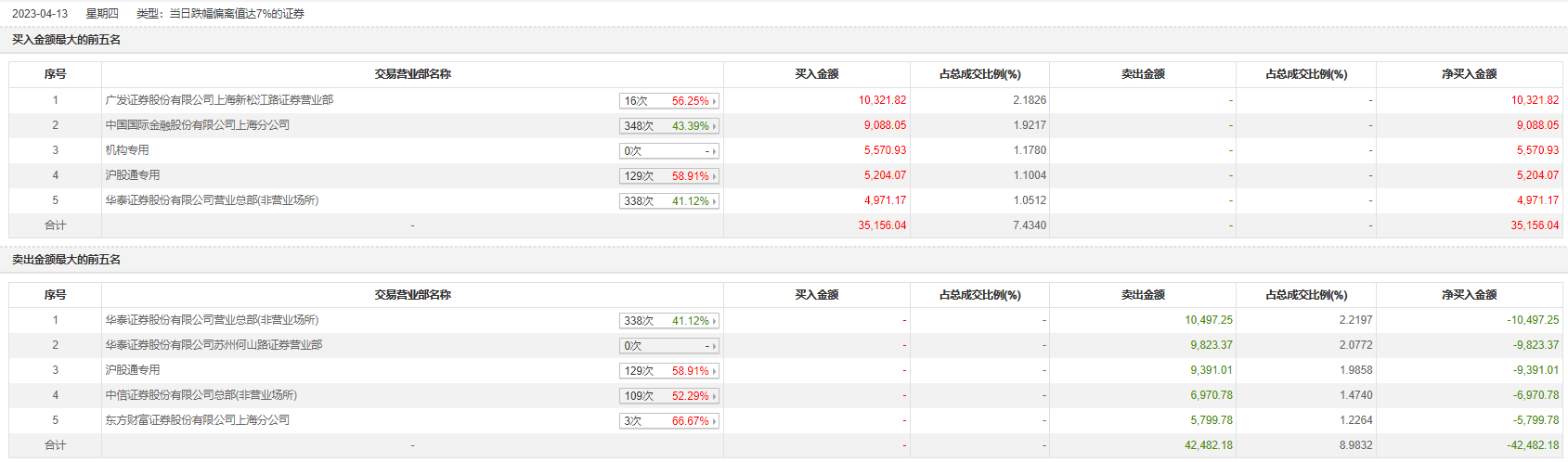 具体来看,机构合计净买入5570.93万元。此外,华泰证券总部、华泰证券苏州何山路证券营业部分别卖出1.05亿元、9823.37万元;广发证券上海新松江路证券营业部、中国国际金融上海分公司分别买入1.03亿元、9088.05万元。