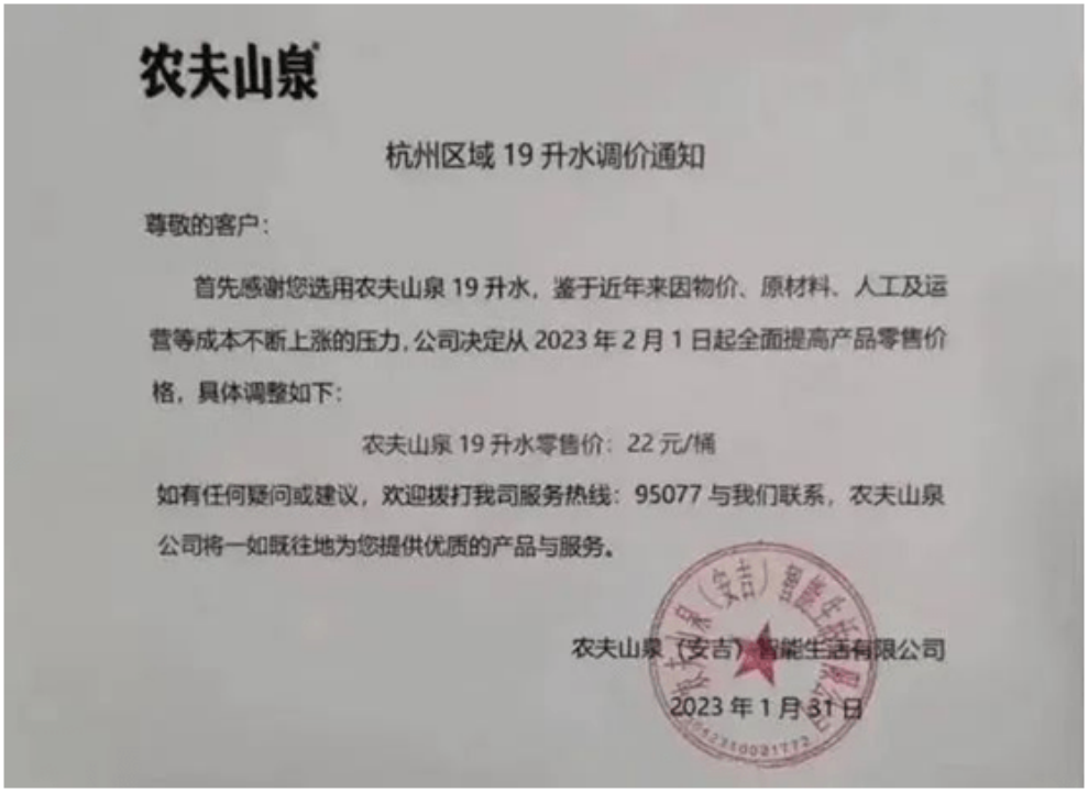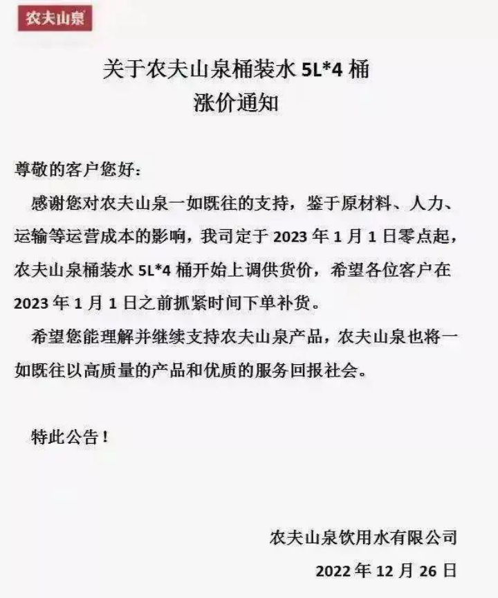 首先,是农夫山泉宣布从今年开始调涨中大包装5L规格包装水的供货价。