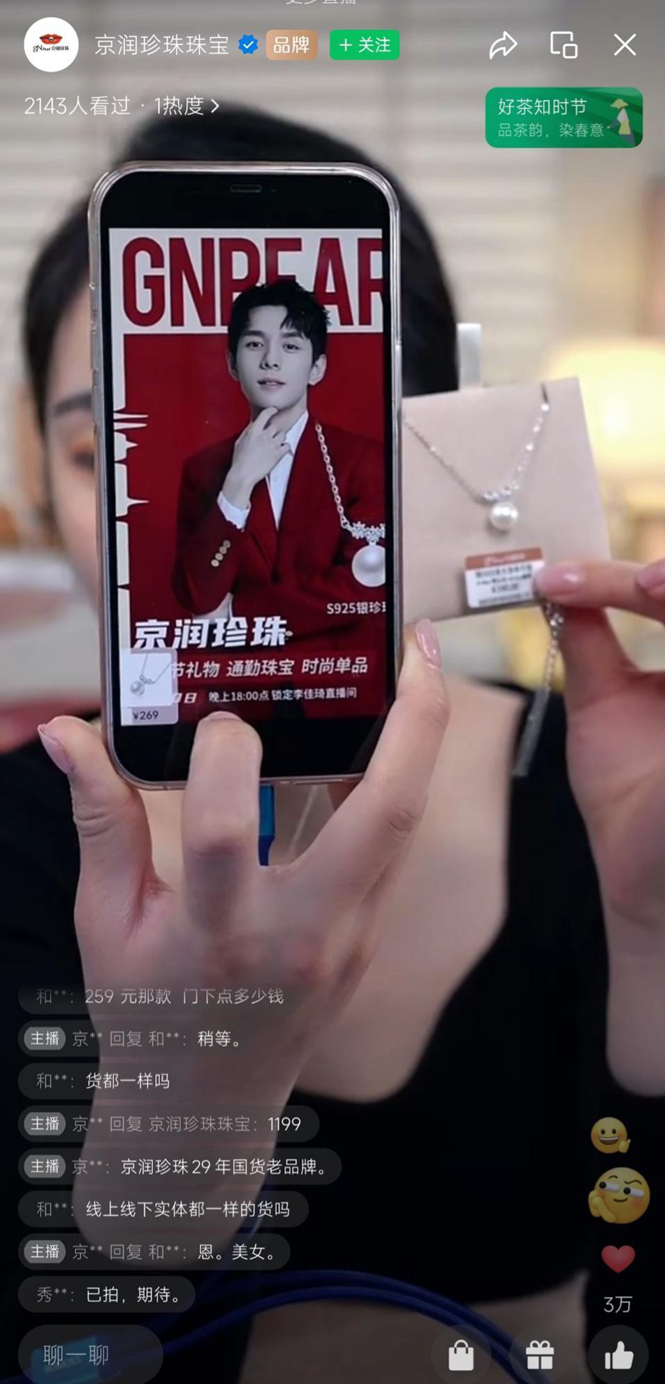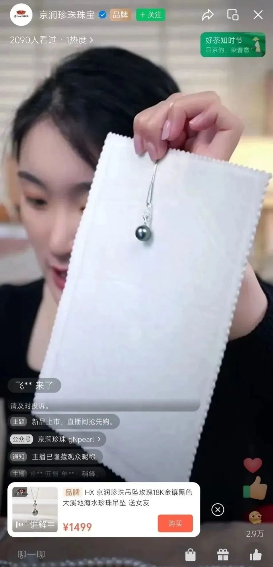 刘倩表示,珠宝是一个特殊的品类,主播得让用户看到首饰戴上身的整体效果。这对直播间的灯光和画面要求也很高——一定要调得更加精致,得把珍珠的光泽感显现出来,让人一看到主播的穿戴效果就觉得高级、想买。