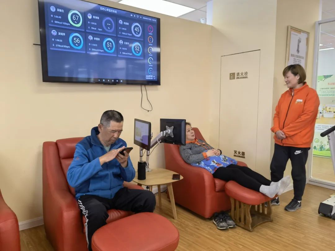 每一位来到长者运动健康之家锻炼的叔叔阿姨都会通过AI智能体测一体机获取体测报告,通过尚体乐活后台小程序生成“运动处方”,在运动健康师的指导下进行针对性锻炼。“叔叔阿姨每天来锻炼前,首先要‘打卡’,进行心率和血压监测,通过实时的血压和心率数据,确定今天的训练日程。”尚体乐活工作人员卢臣干介绍道,“有时候因为路上走得太急,叔叔阿姨测出来血压偏高,我们就会建议他(她)先喝点水、休息一下,或者从比较舒缓轻松的全身律动运动开始一天的锻炼。”