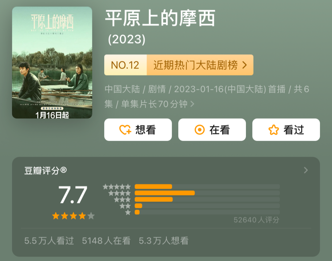 这其实才是《平原上的摩西》电影感的可贵之处,它不再是一种简单的类型元素堆叠或爆款公式模仿,而是自然形成的创作者风格表达。从最终的豆瓣评价与评分来看,7.7分如今也可以排进13部“迷雾剧场”前五,也间接证明了如今的长视频观众并非没有影视审美层面的需求。