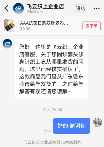 其客服告知,所有服装均源自采购,下单后48小时内从浙江发货。但经反复核实,客服再告知,其中一件“套头修身针织衫”实际是从广东省东莞市发货。
