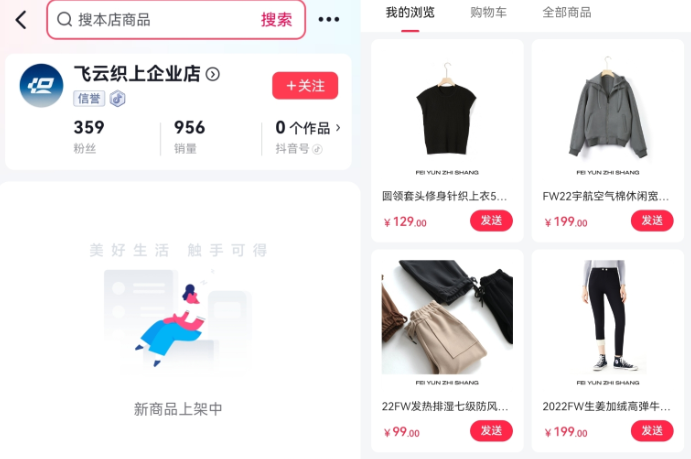 壹览商业发现,飞云织上抖音店,仅359个粉丝,主要售卖时尚女装服饰,店铺内所有产品价格多在129-199区间。包括但不限于航空棉外套、弹力裤、套头针织衫、西装马甲等……,但品类十分有限,上新不超过10个商品;同时最高销量为一条弹力裤,仅售出27件。