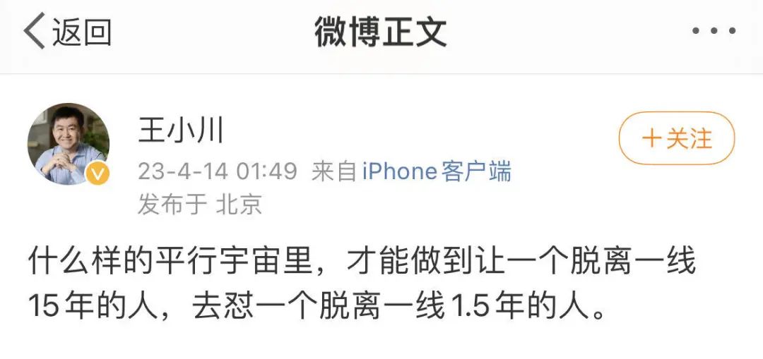意外的是,王小川在14日凌晨又“嘲讽”了一把,称对方是“脱离一线15年的人,去怼离开1.5年的人”。