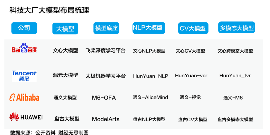 随后的一个多月里,科技巨头、创业公司与高校研究院们展开了一轮关于“大模型”的军备竞赛,整个4月可以被称为“大模型的发布月”,继百度之后,华为、商汤、阿里已在4月亮出自己的大模型产品。