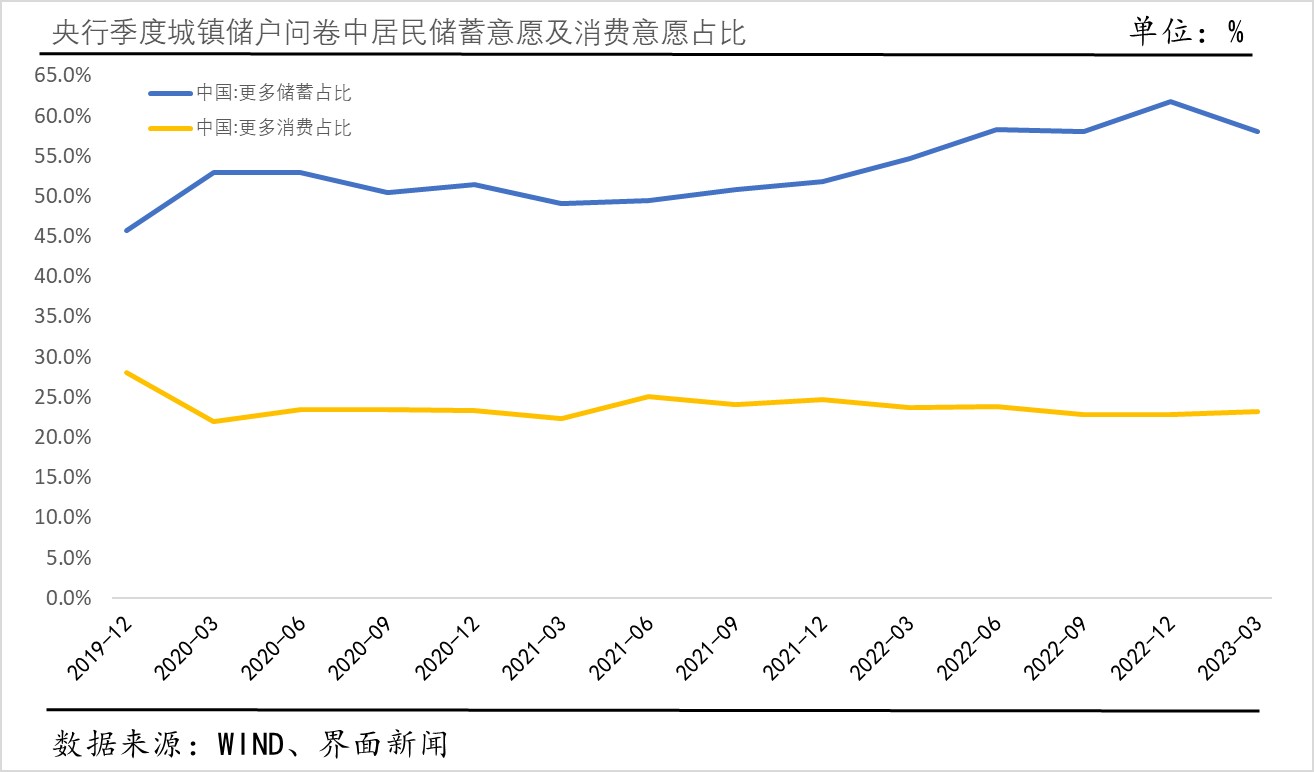 中国人民银行最新一期储户调查问卷显示,倾向于“更多储蓄”的居民占58.0%,比上季减少3.8个百分点,创去年二季度以来新低,但依然处于较高水平;倾向于“更多消费”的居民占23.2%,比上季增加0.5个百分点,是自去年三季度以来首次回升,但较疫情前仍有较大差距。