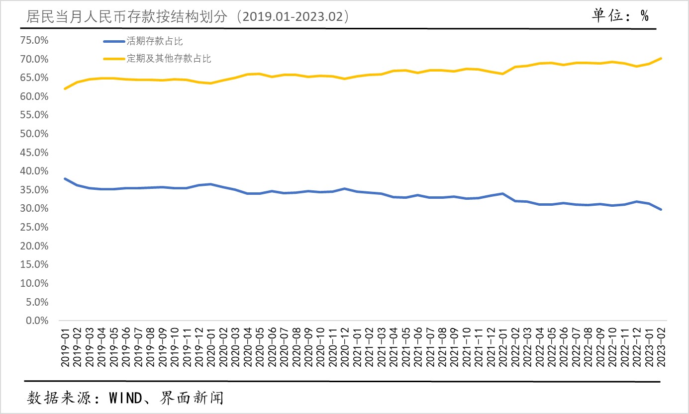 此外,从居民存款结构来看,定期存款仍处于高位。央行数据显示,截至2月末,住户定期及其他存款占全部住户存款的比重高达70.2%,比2019年末的63.8%高出6.4个百分点。分析师指出,这一方面源于信贷投放规模显著增加而带动存款派生,与居民储蓄意愿伴随经济修复出现边际回落不矛盾,但另一方面活期存款占比低,也说明当前居民消费依然缺乏活力。