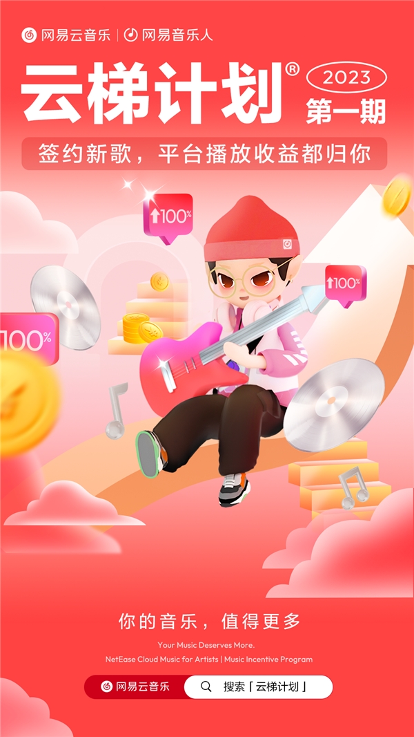 2023年4月14日,网易云音乐发布了其标志性音乐人扶持项目「云梯计划」的最新一期,即「云梯计划2023第一期」。作为原创音乐行业最重要的音乐人激励扶持计划,本次「云梯计划2023第一期」进一步加大了对音乐人群体的收益扶持力度,通过平台播放收益100%归属音乐人等措施,为音乐人群体打造更加良好的创作生存环境,让每一位音乐人都能通过作品收获足够的回报。