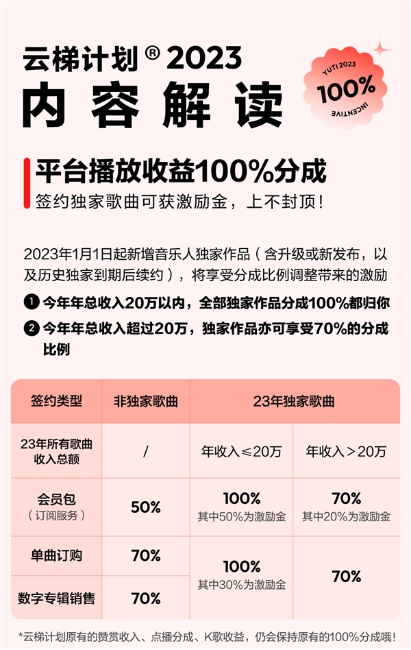 具体来看,「云梯计划2023第一期」将为音乐人优质作品提供丰厚现金激励,自2023年1月1日签约的独家歌曲,将享受分成比例调整带来的激励金奖励,平台年总收入不超过20万的音乐人在平台播放收益分成比将提高至100%,超过20万后亦可享受70%的分成比例。也就是说,在扣除了相关渠道费用和运营成本后,签约了独家歌曲的音乐人,在未来的日子里将从网易云音乐获得100%的包括会员订阅、单曲订购和数字专辑销售等在内的全部收入。且激励金奖励机制为“多签多得,上不封顶”,这意味着签约了独家歌曲的音乐人到手的收益将会有非常可观的提升。