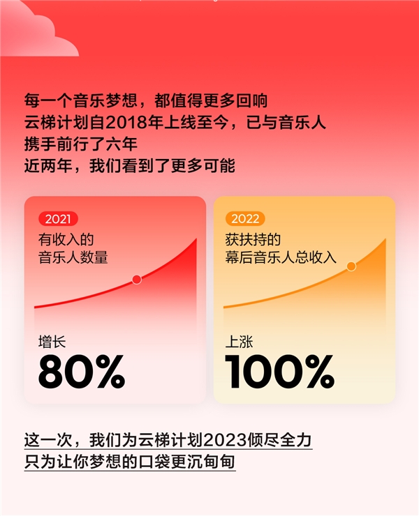 而在今年,网易云音乐再次针对音乐人的所需所求,升级推出了「云梯计划2023」,并于4月率先推出了「云梯计划2023第一期」。根据相关信息,此次「云梯计划2023第一期」主要针对作品平台播放收益对音乐人增加扶持。