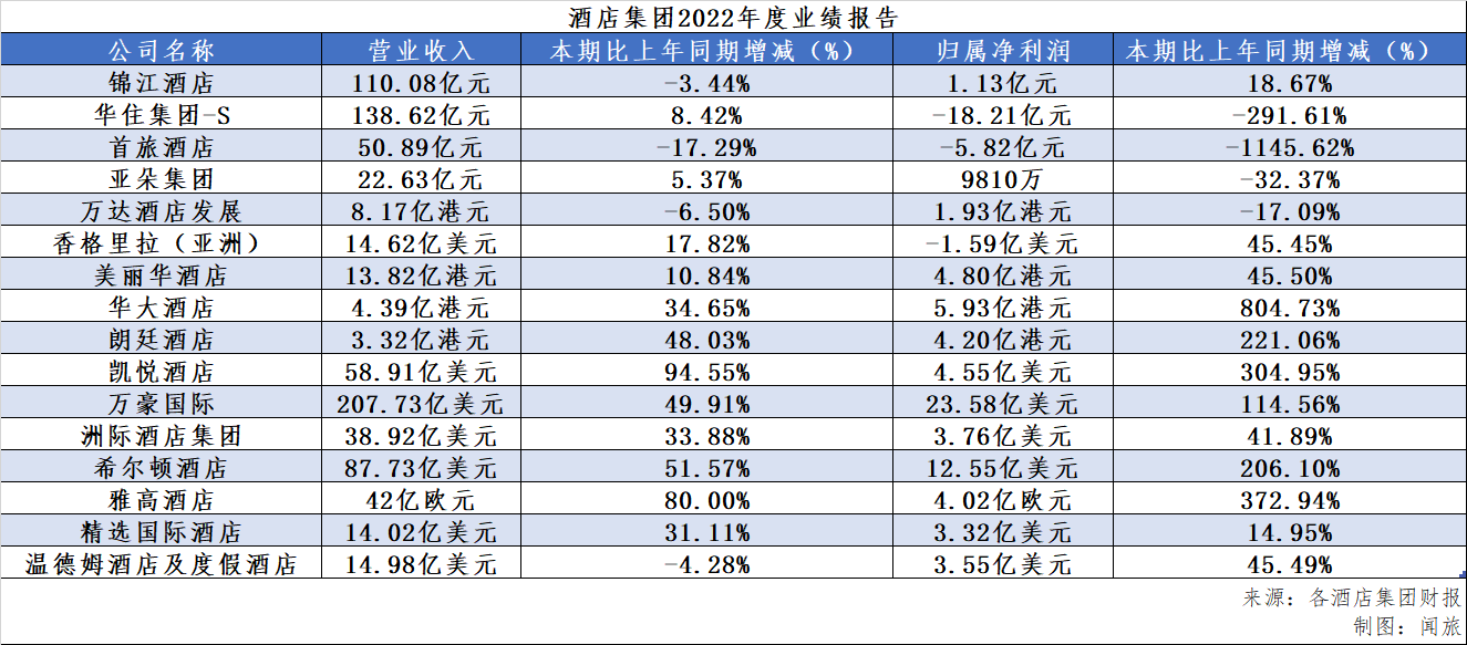 根据闻旅不完全统计,梳理16家上市酒店集团2022年业绩报告数据,我们观察到以下几个特点: