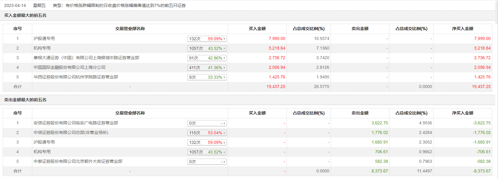 具体来看,机构买入5218.84万元,卖出706.61万元,合计净买入4512.23万元。此外,沪股通专用、摩根大通上海银城中路证券营业部分别买入7999.00万元、2736.72万元;安信证券临安广电路证券营业部、中信证券总部(非营业场所)分别卖出3622.75万元、1776.02万元。