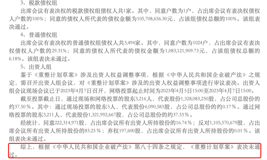 因此,在此次投票表决中,出资人组中进行投票的股东共有3216人,同意的仅占16.74%,83.25%均表示反对。普通债权组中,同意的债权人仅占该组债权总额的6.18%。