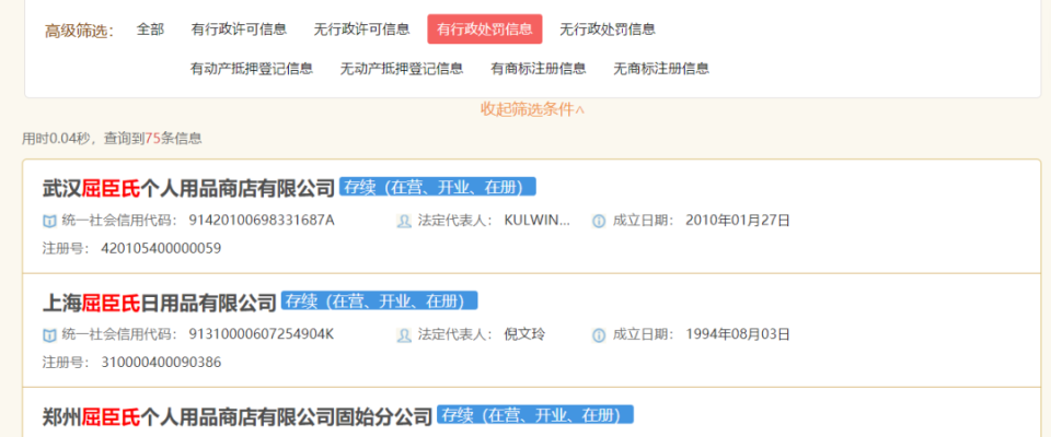 同时,屈臣氏不时被曝出因虚标价格、虚假广告、产品质量等问题遭行政处罚。在国家企业信用信息公示系统中,雷达财经以“屈臣氏”为搜索关键词,以“有行政处罚信息”为高级筛选条件,查询到75条信息。