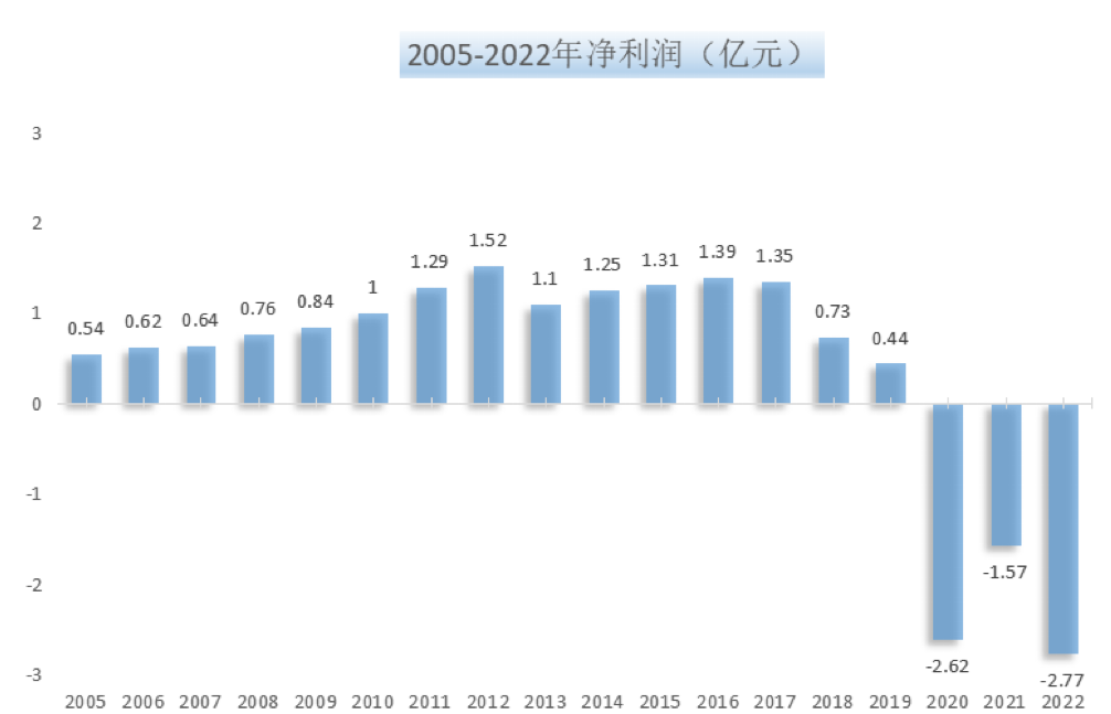 利润方面,增长曲线与营收变化大致相同。从2005年的净利润5376万元,一路飙升到2012年的1.52亿元。此后经过几年的波动,在2019年下降到4462万元。而2020-2022年,则是史无前例的连续三年亏损,分别亏损2.62亿元、1.57亿元、2.77亿元,分别位居历史倒数第二、倒数第三、倒数第一。