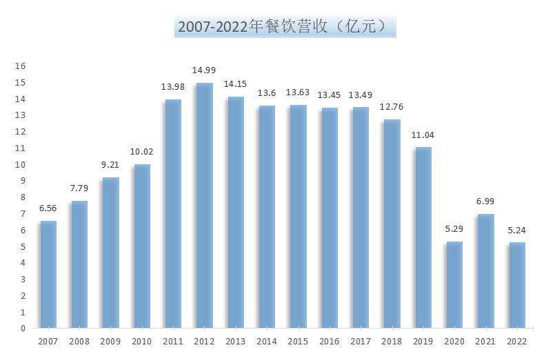 再看全聚德的支柱业务餐饮业务,其营收增长曲线依然与营收变化大致形同。从2007年有统计数据以来,营收从6.56亿元涨到2012年的14.99亿元,在2019年下降到11.04亿元。2020-2022年,则分别为5.29亿元、6.99亿元、5.24亿元,分别位居历史倒数第二、倒数第三、倒数第一。