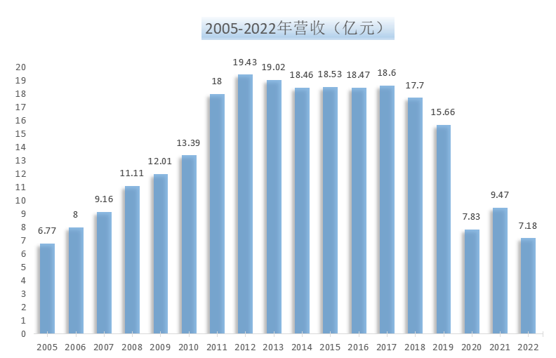 从2013年开始,营收数据开始波动,总体呈下降趋势,到了2019年已回落到15.66亿元。2020-2022年是风云突变的三年,营收直接下降到了“个位数”,分别为7.83亿元、9.47亿元、7.18亿元,分别位居历史倒数第三、倒数第六、倒数第二。