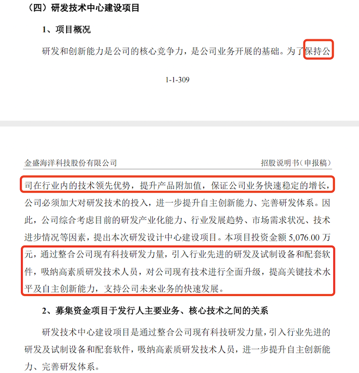 此轮上市,金盛海洋却拟使用5068.00万元募资额建设研发技术中心,意在“保持公司在行业内的技术领先优势、提升产品附加值,保证公司业务快速稳定增长。”;以及“通过整合公司现有科技研发力量,引入行业先进的研发及试制设备和配套软件,吸纳高素质研发技术人员。”来达到“对公司现有技术进行全面升级,提高关键技术水平及自主创新能力,支持公司未来业务的快速发展。”