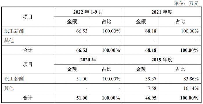 还需指出的是,报告期各期公司研发费用支出均不到70万元。对于研发费用较小的原因,金盛海洋表示系遵从财政部于2021年12月31日印发的《企业会计准则解释第15号》规定,将部分借助产品生产线的研发投入形成的研发试制成品,对外销售确认为营业收入,并遵循收入成本配比原则,将其对应的研发投入计入营业成本或存货导致。