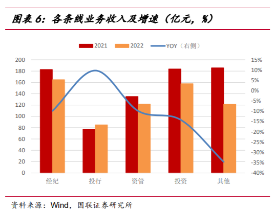 中信证券主营业务包括证券投资业务、经纪业务、资产管理业务、证券承销业务。具体来看,经纪业务为第一大业务,2022年收入164.88亿元,同比下降9.85%;证券投资业务营收同比减少逾10%,达14.22%,营收157.72亿元;资产管理业务营收121.85亿元,同比减少9.84%;主营业务中,仅证券承销业务营收同比增长,增加9.78%,为85.11亿元。