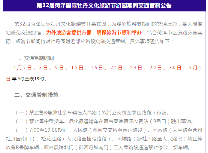 节庆前,菏泽市发布了“第32届菏泽国际牡丹文化旅游节游园期间交通管制公告”。有趣的是,公告直接提到“为外地游客提供方便,确保旅游节顺利举办”,就是这么直白。