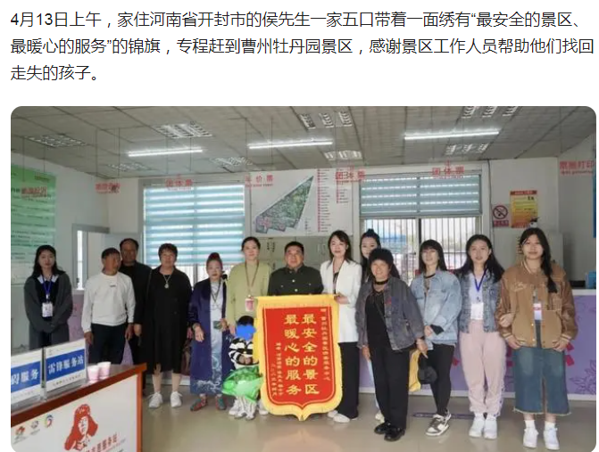 而就在4月13日,有报道称,家住河南省开封市的侯先生一家五口带着一面绣有“最安全的景区、最暖心的服务”的锦旗专程来到曹州牡丹园景区,感谢景区工作人员帮助他们找回了在景区走失的孩子。
