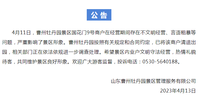 “曹州牡丹园景区国花门9号商户在经营期间存在不文明经营、言语粗暴等问题,严重影响了景区形象。曹州牡丹园按照有关规定和合同约定,已将该商户清退出园,相关部门正在依法依规进一步调查处理。”