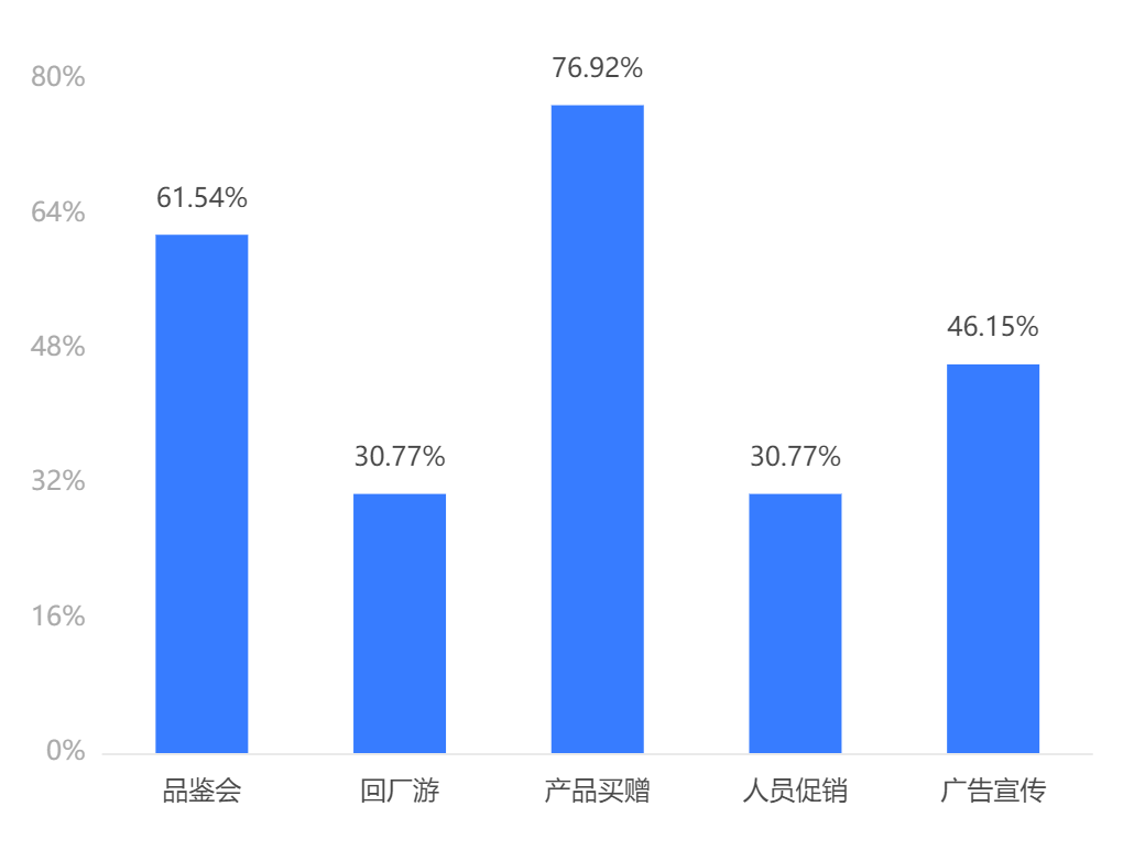 调查结果显示:酒商最喜欢的促销方式是产品买赠,其次是品鉴会,最后是广告宣传,占比分别为76.92%、61.54%、46.15%。