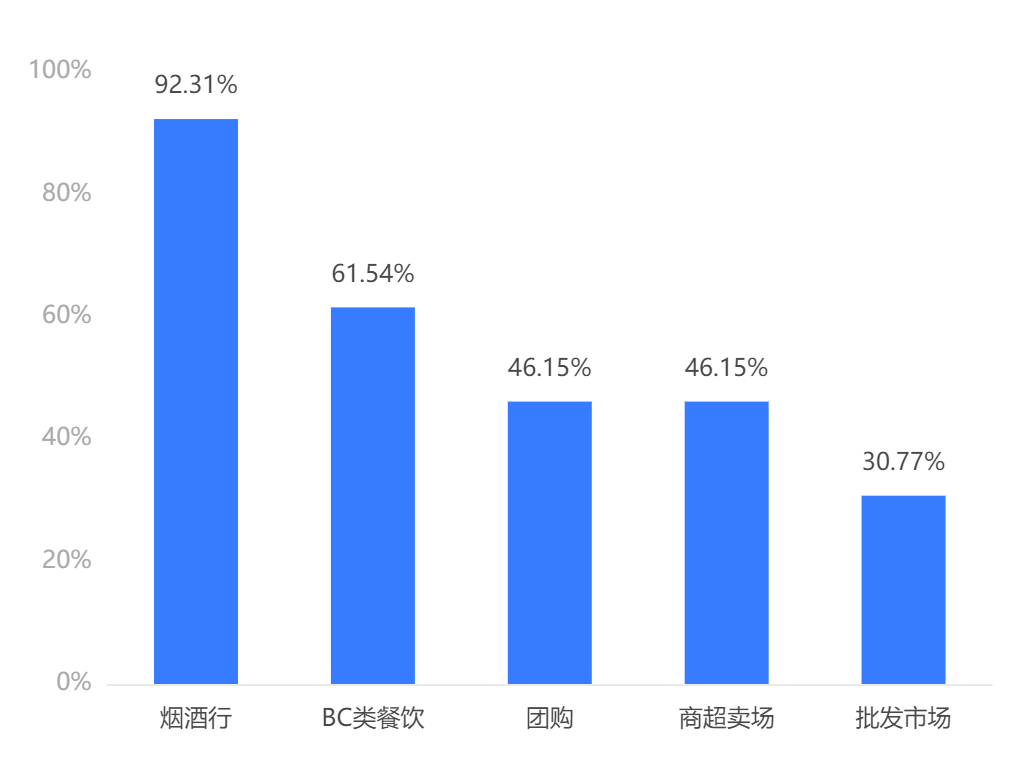 在渠道方面,与中高端酱酒主销团购不同,经营百元酱酒经销商首选烟酒行、名烟名酒店,其次为BC类餐饮,最后才是团购。三者占比分别为:92.31%、61.54%、46.15%。