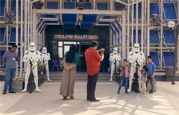 开罗郊外的沙漠不仅有星星点点的炼油厂,还有一座独具特色的中国主题公园。你可以在这里看到Hello Kitty与一位神枪手、一只企鹅站在一起,你还可以看到水滑道边上有一群星球战士守护着公园入口。游客们可以坐在碰碰车上用镭射枪互相攻击。