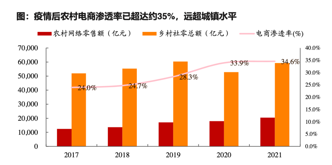 据人民网研究院的统计,到2021年农村电商的渗透率(农村电商销售额/农村社会零售总额)已经达到34.6%。而同期中国电商的整体渗透率为25%,这意味着疫情之后,农村的电商渗透率已经超过社会平均水平。